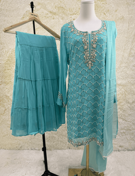 This Pink Anarkali, made from georgette, features intricate handwork and a flattering heart-shaped neckline. The long gown design adds elegance, making it ideal for special occasions and formal events.