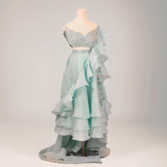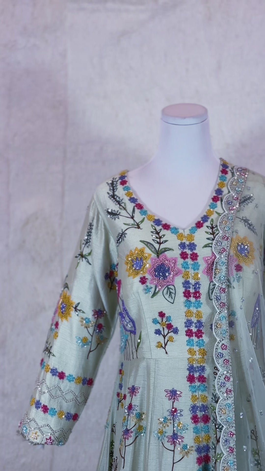 Stunning Anarkali in a refreshing mint green hue, crafted from luxurious raw silk.