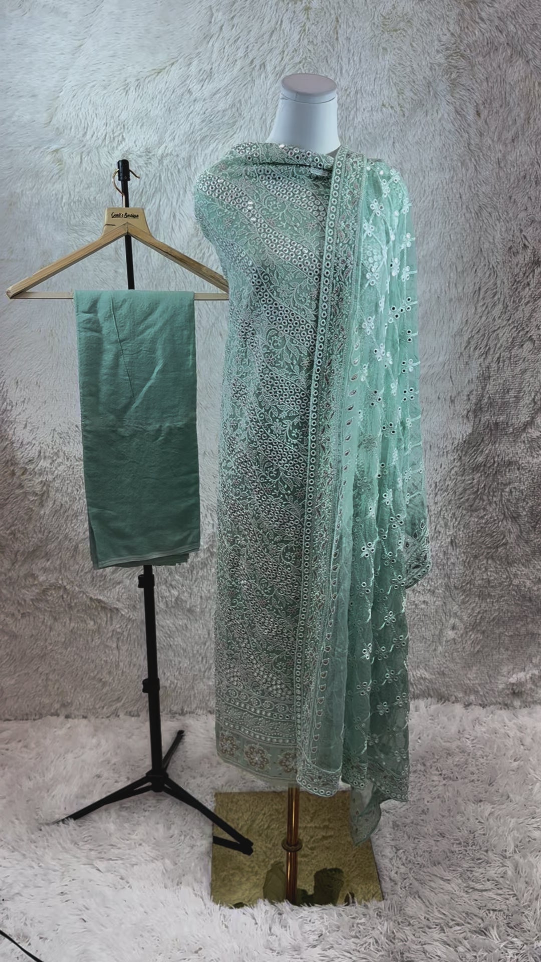 This Mint Green ensemble combines the elegance of georgette with intricate chikankari and dazzling mirror work. Paired with a matching dupatta and soft cotton shantoon pants, this unstitched suit will be tailored just for you, making it a perfect choice for festive celebrations!